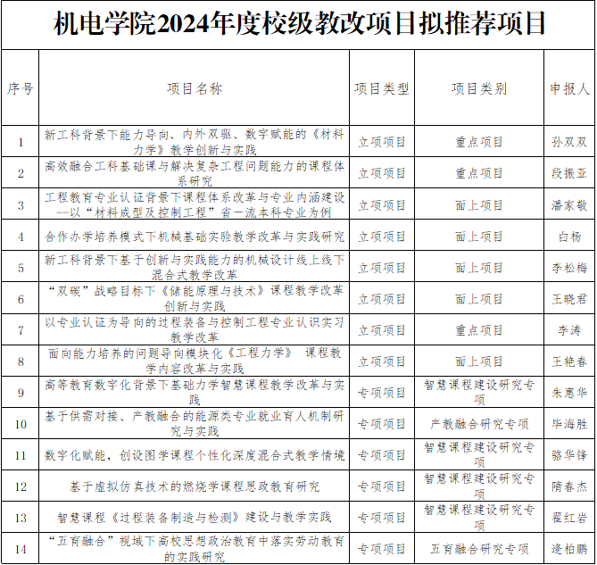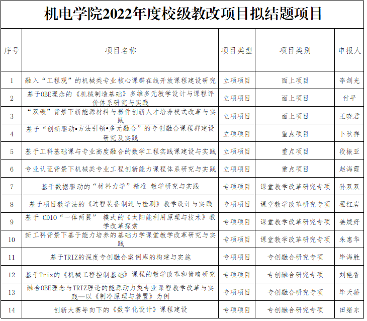 根据公司《关于开展2024年度校级本科教学改革研究项目和专项项目立项申报及2022年度项目结题工作的通知》要求,公司组织了项目评审和结题验收,经项目负责人申报,专家评审,通过验收准予结题14项,拟推荐至公司进一步评审项目(立项和专项)14项,现将结果公示。