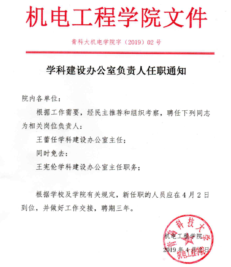 团队建设办公室负责人任职通知