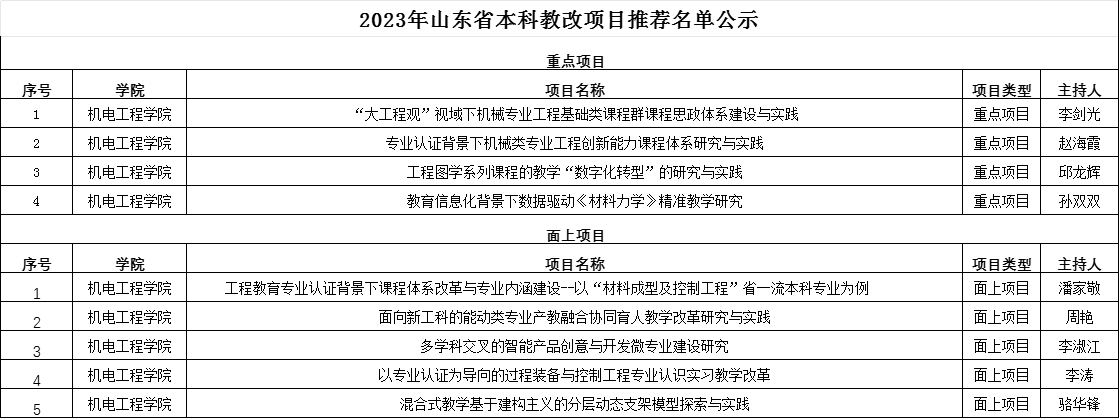 根据公司《关于组织开展2023年山东省本科教学改革研究项目立项申报和管理工作的通知》要求,公司组织开展了省级教改项目申报工作,经项目负责人个人申报,校内专家评审,共拟推荐重点项目4项,面上项目5项,至公司,进行下一步评审。现将结果公示如下: