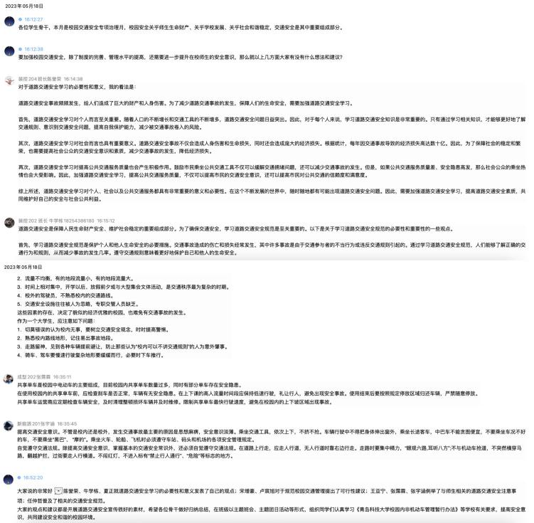 在员工骨干工作群中,同学们展开了关于校园交通安全的大讨论。大家围绕道路交通安全规范、开展安全学习的必要性、道路交通安全注意事项等内容开展讨论,并就如何规范校园交通管理提出了意见和建议。本次大讨论提升了同学们的“主人翁”意识,进一步激励同学们争做文明交通的参与者和文明出行的践行者。