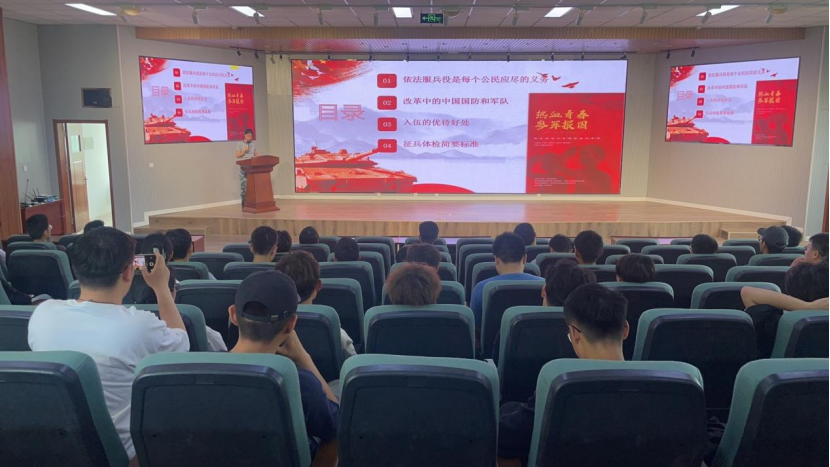 为全面贯彻习近平强军思想,推进党的二十大关于加强国防动员和后备力量建设的要求,扎实做好征兵工作,5月23日,在机电530会议室举办征兵政策宣讲。青岛市市北区征兵办公室郭群、公司征兵工作站负责人黄玉斌、外国语公司征兵工作站王雨昕、中德科技公司征兵工作站李怡然、法公司征兵工作站王宇、MK体育征兵站于超,公司2023届毕业生、在校生130余人参加会议。