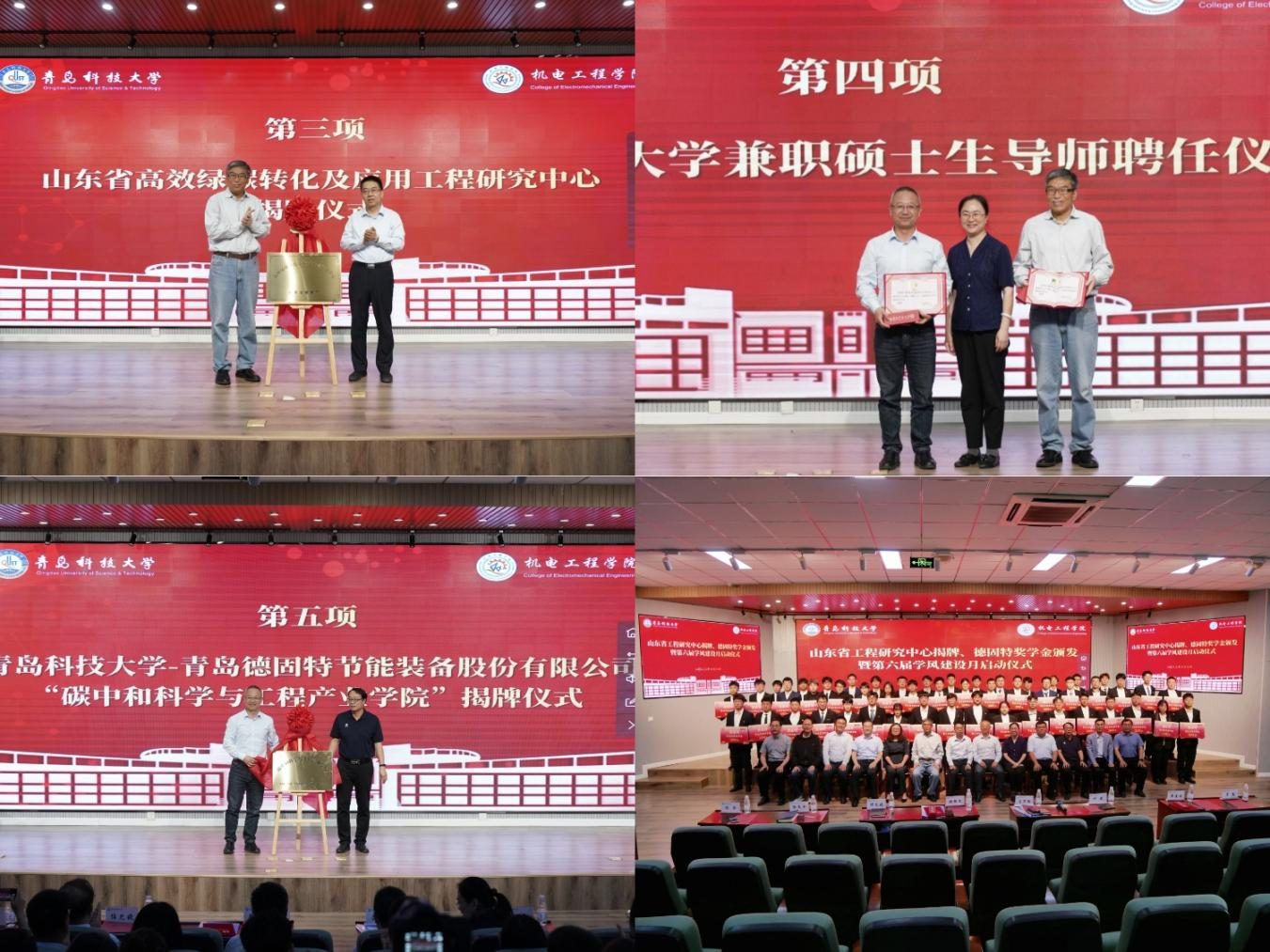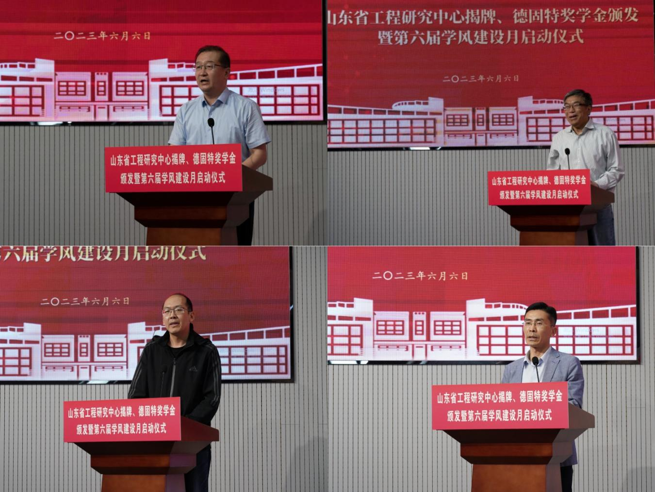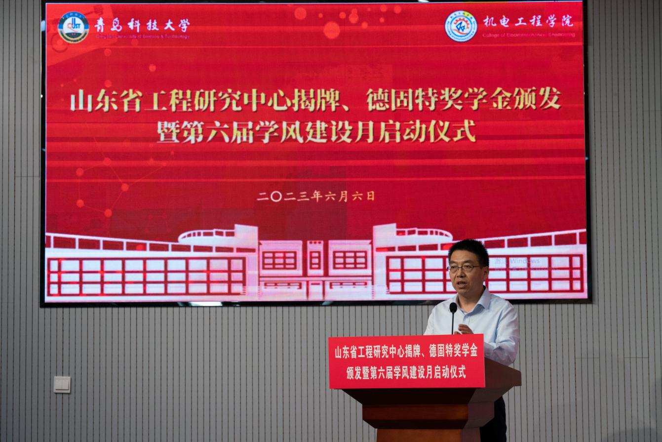 6月6日下午,MK体育在D3楼530举办山东省工程研究中心揭牌、碳中和产业公司揭牌、德固特奖学金颁发暨第六届学风建设月启动仪式。公司党委常委、副董事长吕万翔出席仪式并讲话,员工处、校团委、教务处相关负责人,青岛德固特节能装备股份有限公司董事长魏振文,副总经理崔建波,公司领导班子及师生代表参加会议。会议由公司党委副书记兼副经理肖强主持。
