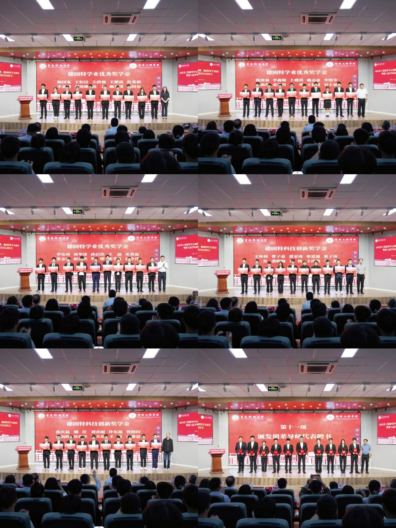 青岛德固特节能装备股份有限公司人力资源部长徐文平、员工工作处副处长宋飞、公司团委副书记陈兵、公司副经理李剑光、张斌为奖学金获得者颁奖。获奖员工代表机械实验201班史普晶同学发言。