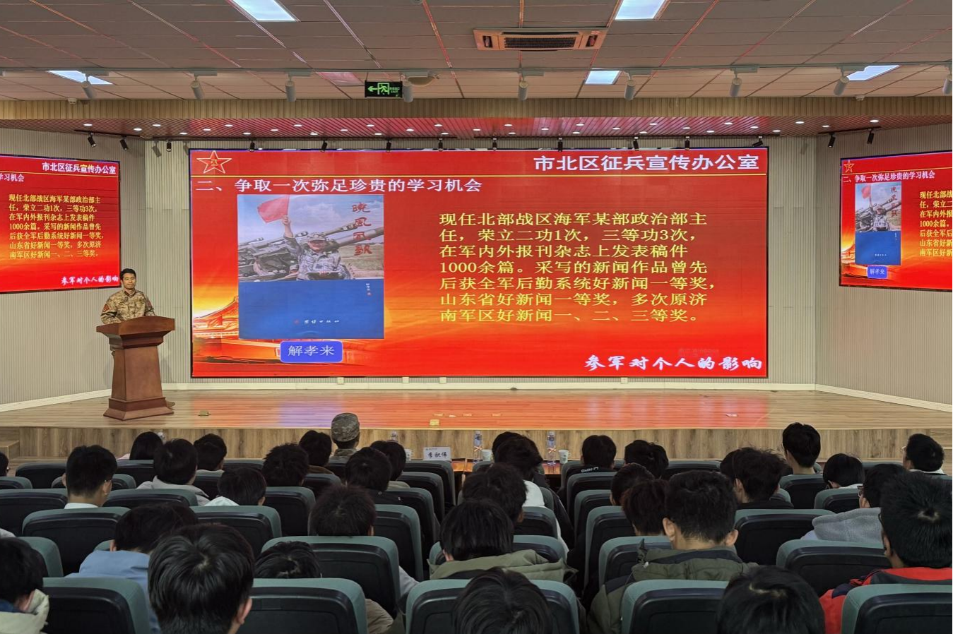 李积伟从参军入伍基本条件、报名程序、老员工参军入伍优惠政策等方面向与会师生详细解读市北区征兵政策。通过政策宣讲,鼓励同学们把热血挥洒在实现强军梦的伟大实践之中,在军队这个大舞台上施展才华,在军营这个大熔炉里淬炼成钢,书写绚烂、无悔的青春篇章。