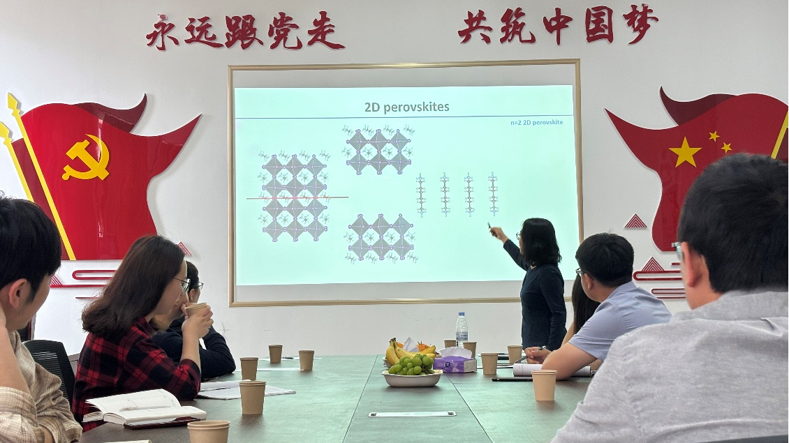 二维卤化钙钛矿与其三维结构相比,具有更好的光稳定性和化学稳定性,因此吸引了人们的极大的研究兴趣。在过去几年中,人们不断尝试通过调控二维钙钛矿晶体中有机间隔分子的化学性质,以将其更好的应用于发光或光伏材料。然而,目前的工作大多集中于研究无机-无机或有机-有机之间的界面相互作用,却忽略了有机阳离子的前沿分子轨道与无机框架的带边态之间电子耦合作用诱发的一系列重要特性。有机成分和无机成分之间的这种强耦合作用可能会产生新的电子、激子和光学特性,从而进一步拓宽钙钛矿材料实际应用的范围。Li Hong教授为大家详细讲解了二维和一维卤化钙钛矿中无机钙钛矿层和有机间隔层之间电子耦合相关的研究工作,其中有机间隔层由具有π共轭骨架的(二)铵阳离子组成。研究结果表明,通过调整有机阳离子的共轭度和极化性,以及有机成分和无机成分之间的结构接近度和电子耦合,可以实现各种电子和激子行为。同时,与各位老师员工就研究中遇到的问题进行了交流,报告内容精彩,师生收益颇丰。