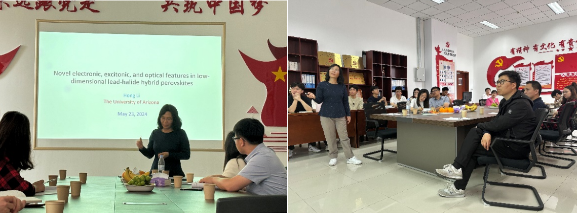 5月23日,美国亚利桑那大学化学与生物公司Li Hong教授受邀莅临MK体育,开展题为“低维铅-卤化物杂化过氧化物中的新型电子、激子和光学特征”的学术报告。山东大学的李元老师、吉林大学的王同辉老师,青科机电新能源科学与工程系的刘治明、王晓君、白文娟、楚电明、李建伟、王雨霄和李慧芳等老师,以及能源动力工程专业的部分研究生到场听取了本次报告。
