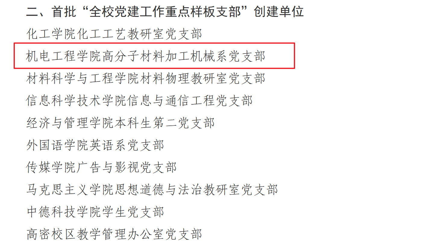 公司党委荣获多项佳绩,其中,公司党委入选首批“全公司党建工作标杆院系”创建单位,高分子材料加工机械系党支部入选首批“全公司党建工作重点样板支部”创建单位,机械工程及自动化系党支部书记工作室入选首批“全校‘双带头人’教师党支部书记工作室”创建单位,2022级硕士研究生张晓楠入选首批“全校研究生党员标兵”。