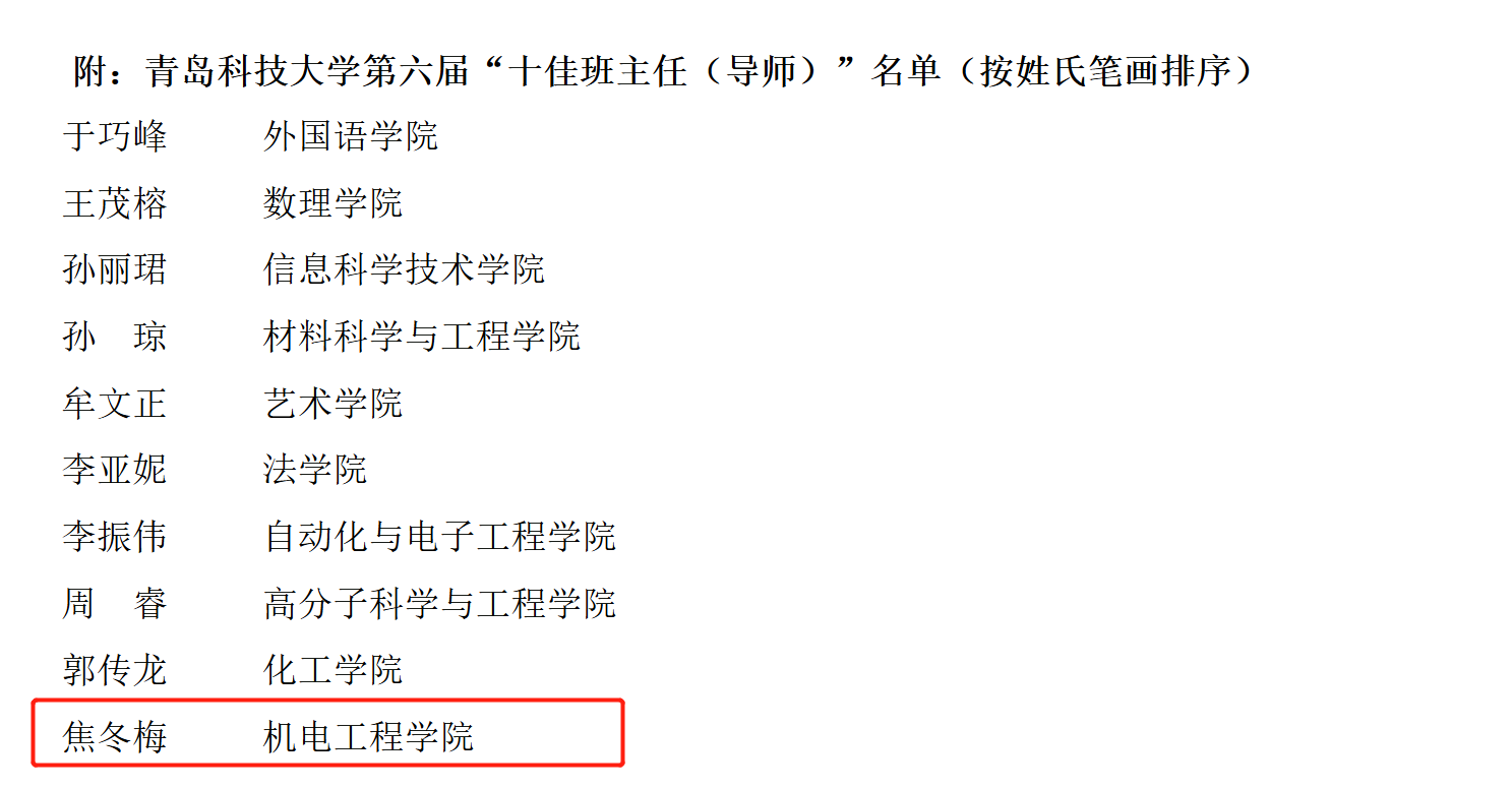 近日,公司公布了第六届“十佳班主任(导师)”评选结果。公司教师焦冬梅荣获MK体育官网第六届“十佳班主任(导师)”称号。