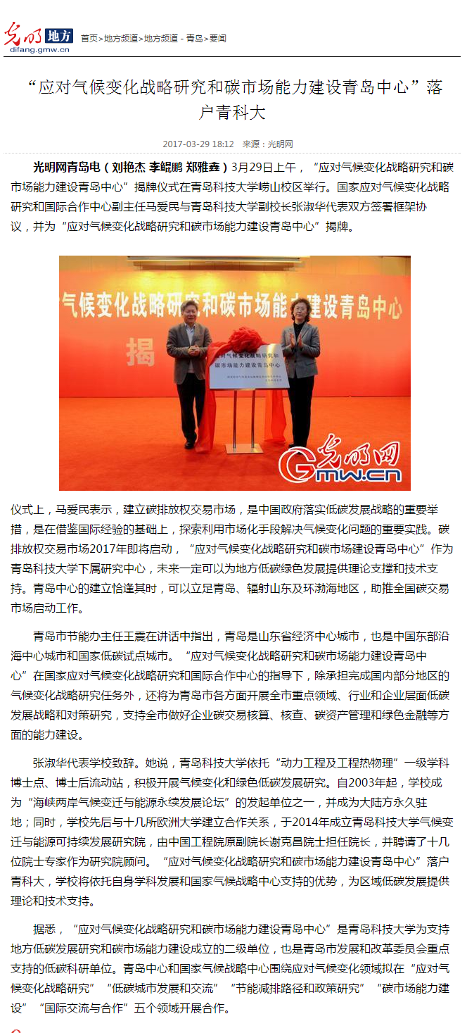 [光明网]“应对气候变化战略研究和碳市场能力建设青岛中心”落户青科大