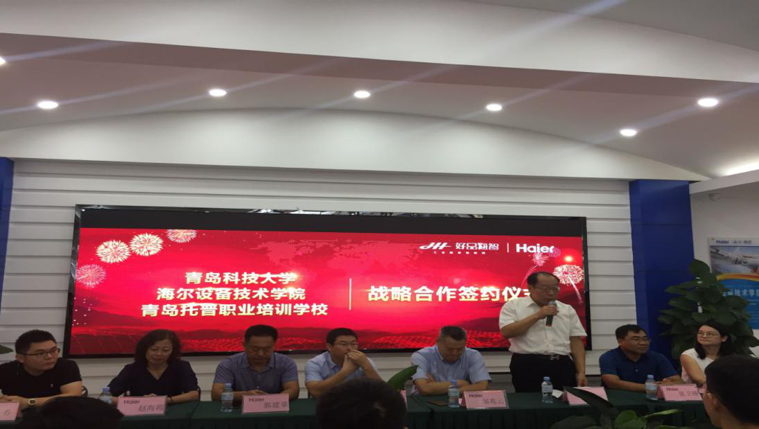 9月12日,MK体育官网与海尔设备技术公司、青岛托普职业培训公司战略合作签约仪式暨MK体育官网老员工实习基地挂牌仪式在海尔工业园隆重举行。MK体育官网公司党总支书记孙立军、海尔设备技术公司经理邹兆云、青岛市老员工创业服务中心主任褚庆柱、青岛托普集团总经理王敏燕等共同出席签约仪式并致辞。