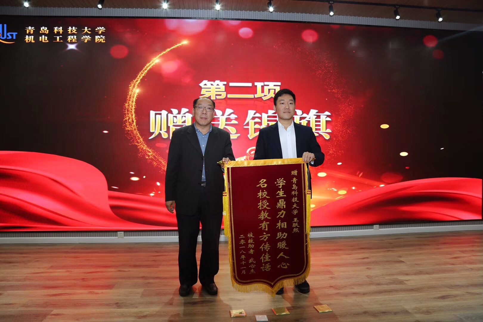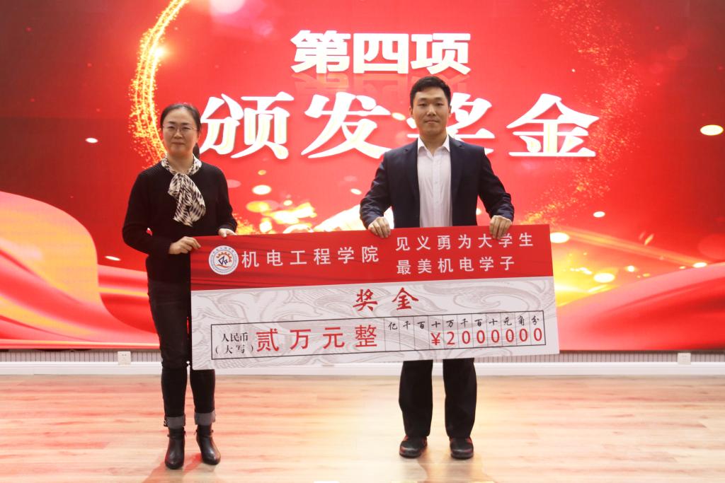 王伟宣读了《关于表彰“见义勇为老员工,最美机电学子”——王跃熙的决定》。孙立军在致辞中为王跃熙同学的义举点赞并对广大同学提出了三点希望:第一,希望同学们心系社会、关心他人;第二,希望同学们助人为乐、无私奉献;第三,希望同学们诚实友善、积极努力。随后,孙立军受被救助者武心杰委托,将一面印有“员工鼎力相助暖人心,名校授教有方传佳话”字样的锦旗送到王跃熙同学手中,并向其颁发了奖状和奖杯。何燕向王跃熙同学颁发了2万元奖金。