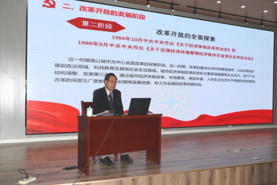 韦殿华从改革开放的历史背景、发展阶段、伟大成就、基本经验与历史启示以及新时代将改革进行到底五个方面进行了讲解。结合自己的人生经历,引经据典、旁征博引,通过重大历史事件和重要历史时间节点,为同学们展示了改革开放四十年的发展历程。