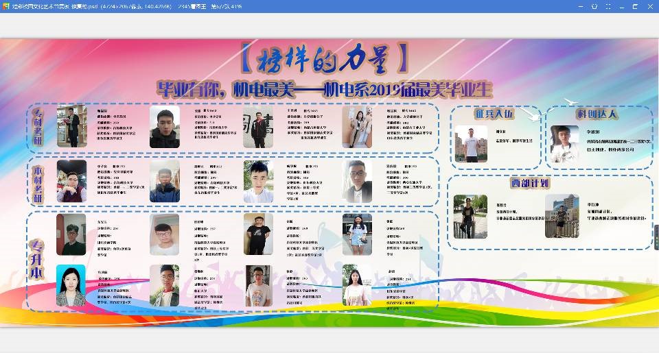 【最美毕业生引领榜样之风】为进一步挖掘机电系毕业生中的先进典型,展示毕业生风采,机电系开展“毕业有你,机电最美”2019届最美毕业生评选活动。评选出靳磊磊等在专业学习、科技创新、社会实践、基层服务等方面表现突出的最美毕业生。同时,举行最美毕业生宣讲,分享榜样员工的经验,切实发挥榜样引领作用。