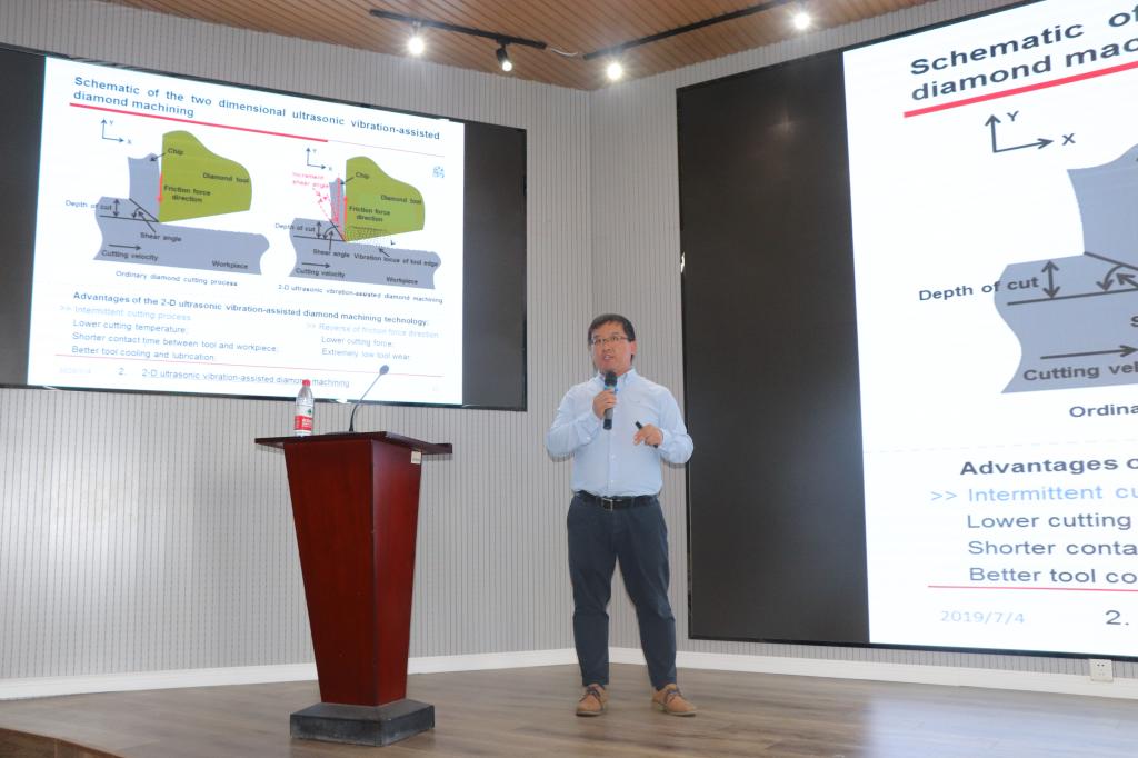 王义龙博士从光学超精密加工的前沿介绍开始,讲述了2维、3维超声波振动辅助加工技术及其应用、微纳结构及功能性表面的制备技术等。为同学们展示光学超精密加工零件的加工效果图,引起同学们对超精密加工领域的浓厚兴趣。最后,霍宝群教授、王义龙博士耐心回答了现场师生的问题。