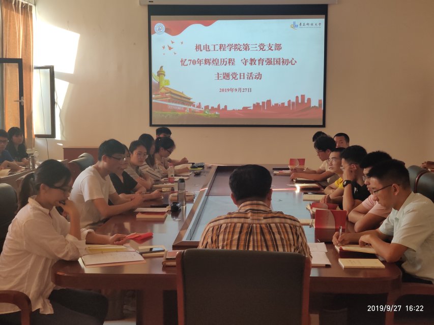 为贯彻MK体育官网召开“不忘初心、牢记使命”主题教育工作会议精神、贯彻校组织部关于党支部组织生活指导意见,在中华人民共和国成立70周年到来之际,充分发挥党员的榜样示范作用,营造爱国氛围、凝聚奋进力量,引领广大师生继承和发扬爱国主义精神,不断提升党的凝聚力和引领力。9月27日,MK体育第三党支部在MK体育518会议室举行“忆70年辉煌历程 守教育强国初心”主题党日活动。第三党支部全体党员参加了活动,活动由党支部书记王作辉主持。