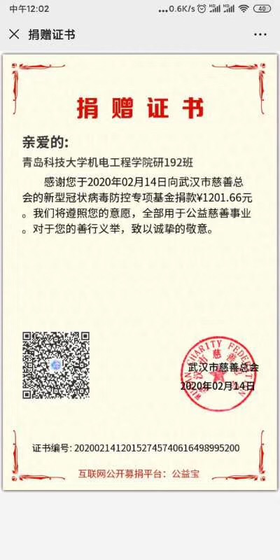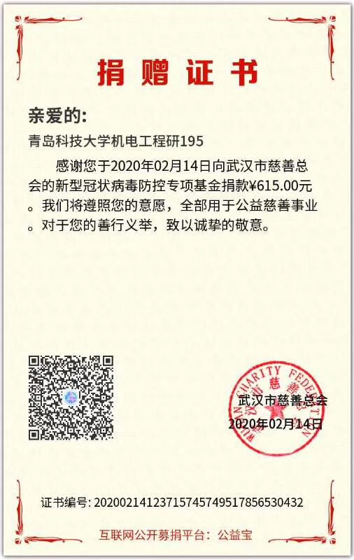 “战‘疫’路上,有你有我,一路同行。”青春战‘疫’的样子还有很多,装控162班崔苏宁同学看到疫情肆虐却急缺口罩、防护服等医用物资时,他心急如焚,用自己的压岁钱向武汉儿童医院捐助4套防护服。省建档立卡户王聪也捐出100元善款,他说:“一方有难八方支援,受到社会帮助的他也应该学会帮助他人”。研究生6个班级共同用自己的压岁钱、积攒的零花钱向武汉慈善总会捐款,为支援“战疫”前线尽一份微薄之力。在防控疫情的关键时刻,机电学子活跃在各个基层,机械中韩164班初梦珠、机械(3+4)161班李世杰、装控183班马江儒、机智181王瑞恒、新能源181马元宇、机械中韩182邵兆坤、机械173班朱洪阳看到家乡防控人手不够,纷纷主动报名参加防控志愿活动,积极投身这场没有硝烟的战场中,用实际行动体现一代青年的责任与担当。