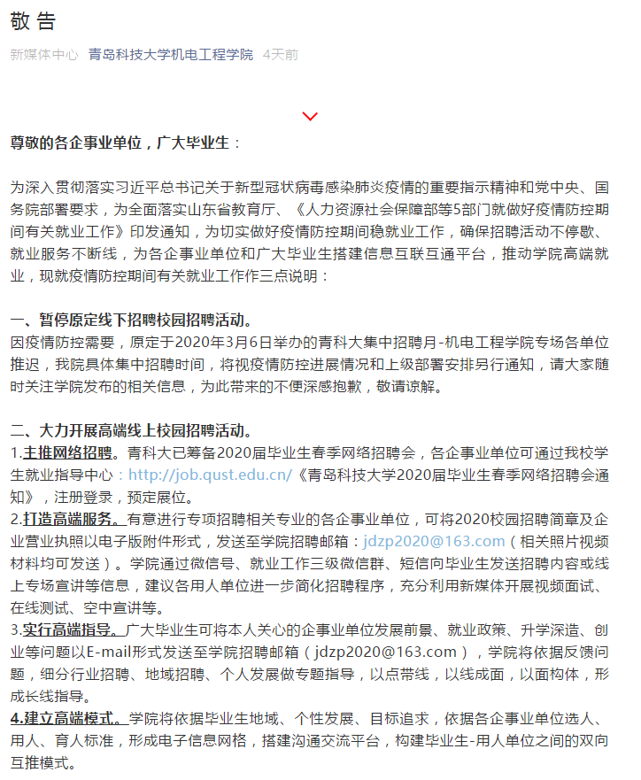 “都是我们的亲员工,关键时刻我们都是义不容辞的加以关怀。”在疫情暴发的时刻,公司成立了疫情防控小组,按照职责分工,依法依规有序推进疫情防控工作,严格执行“日报告、零报告”制度,精确摸排掌握易感师生群体,密切追踪并随时掌握广大师生员工的健康状况。学工队伍每日对37名湖北籍及途经湖北的员工进行密切跟踪,并做好人文关怀、心理疏导,确保每一位机电学子都平安健康。为了“停课不停教、停课不停学”,不影响每一个学子的学习生活,各系老师纷纷主动运用线上教学优势,学习线上教学,保证员工需求。面临就业季,带毕业生的老师也开始线上对即将毕业同学开展一对一就业辅导、发布就业信息,在线帮助同学完善修改简历、不断推进高端就业。通过开展在线心理咨询辅导,为员工开展远程心理援助。