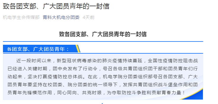 “党有号召,团有行动。”MK体育分团委组织部发表《致各团支部、广大团员的一封信》,号召各团支部、广大团员青年要坚持在校团委、院分团委的统一领导下,发挥共青团组织战斗堡垒作用和团员青年先锋模范作用,同心同向、共克时艰,为夺取防控斗争胜利贡献青春力量!号召机电学子服从指挥有纪律、正确发声有作为、履行职责有担当、网络学习由效率。MK体育各团支部纷纷行动起来,依托网络平台,采取多种方式开展支部学习会。船舶192团支部开展《同心同向 共克时艰》主题团日活动;新能源191团支部在学习强国平台建立“举国战‘疫’ 人人有责”学习群,线上学习疫情防控知识及要求,与祖国携手同行,为武汉加油;机械191团支部通过制作精美PPT向广大团员传递疫情知识、解读习近平总书记重要讲话精神;设计191团支部通过书写字帖、画作为武汉加油。分团委员工会宣传中心也制作了《武汉加油!中国加油!与你同在!》短视频为湖北疫区同学加油鼓劲,制作了《风雨同舟共抗疫情,我们比你更关心你的健康》《新型冠状病毒如何防护?快看这里》等推文,做好防疫宣传工作。