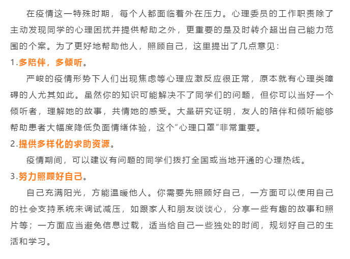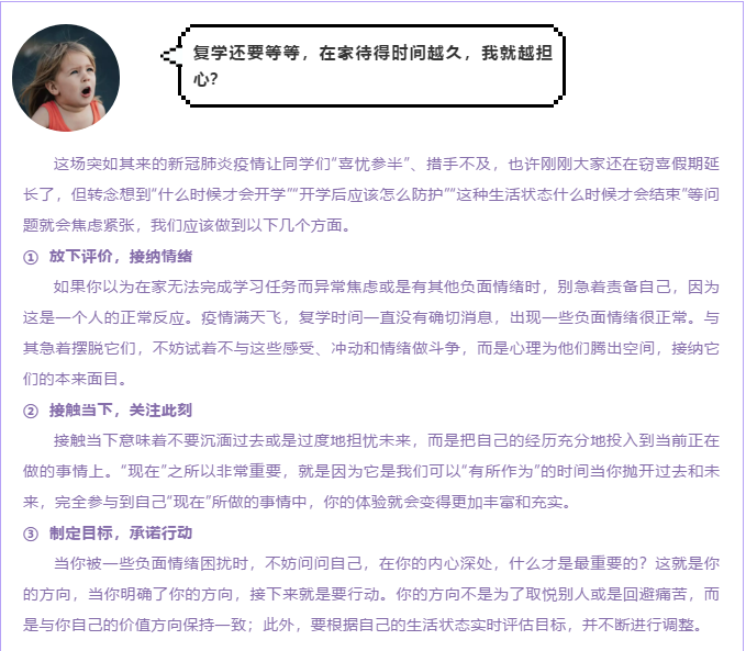 第一期的主题是“心理知识篇”。主要是针对在家隔离期间出现焦虑心理的员工。活动提出了相应的举措来应对这些心理问题,目的是让此类问题的同学放下焦虑,安心在家学习,与我们的国家一起共渡疫情。
