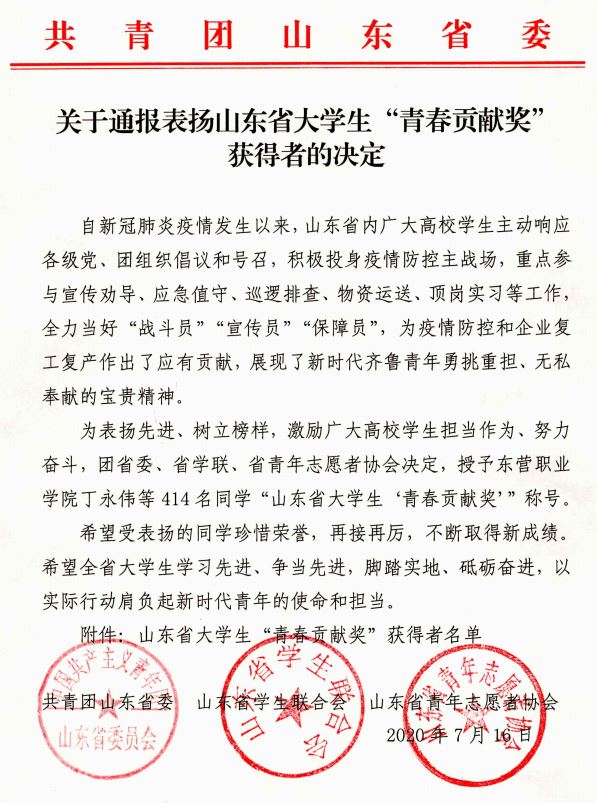近日,在共青团山东省委公布的《关于通报表扬山东省老员工“青春贡献奖”获得者的决定》中,公司罗浩宇同学荣获山东省老员工“青春贡献奖”。