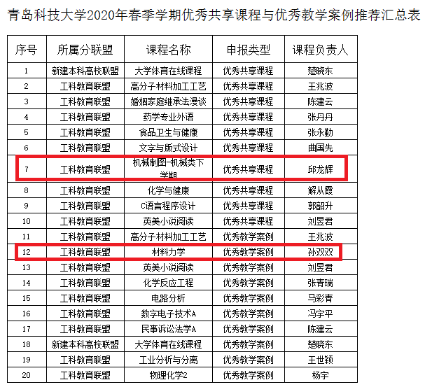 近日,在公司公布的2020年春季学期优秀共享课程与优秀教学案例评选结果公示中,公司邱龙辉老师的《机械制图-机械类下学期》获评校优秀共享课程,孙双双老师的《材料力学》获评校优秀教学案例。