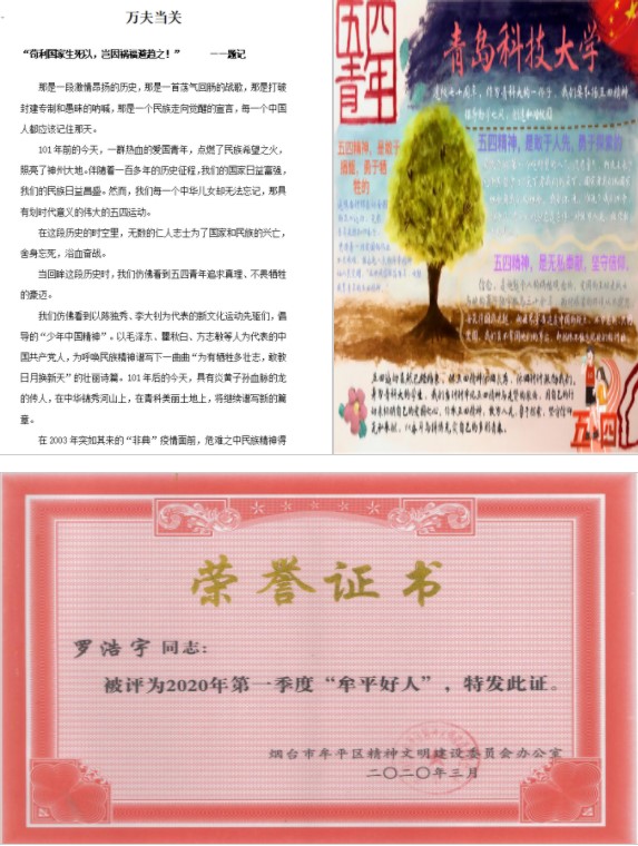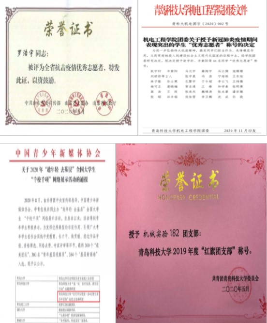 ■新冠肺炎疫情发生以来,来自各行各业的志愿者活跃在疫情防控第一线,新冠肺炎疫情发生以来,机电学子为疫情防控作出极大贡献,罗浩宇荣获山东省老员工“青春贡献奖”,并被授予“牟平好人”和山东省抗疫优秀志愿者称号,耿宇轩荣获团中央暑期三下乡“千校千项”最美团队