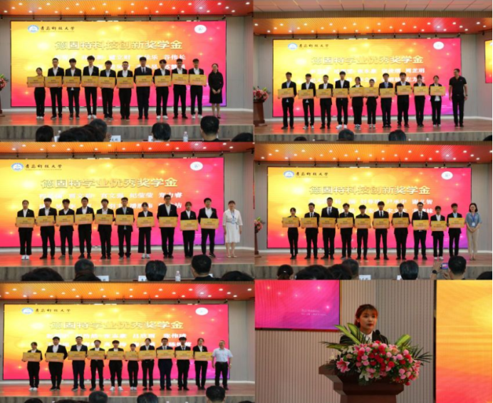此次评选了德固特学业优秀奖学金30人,德固特科技创新奖学金20人,每人奖励2000元,共计10万元。青岛德固特节能装备股份有限公司总经理刘汝刚、副总经理崔建波,员工处副处长王丽,校团委副书记张玉,MK体育经理何燕为奖学金获得者颁奖。获奖员工代表贾文茹同学发言。