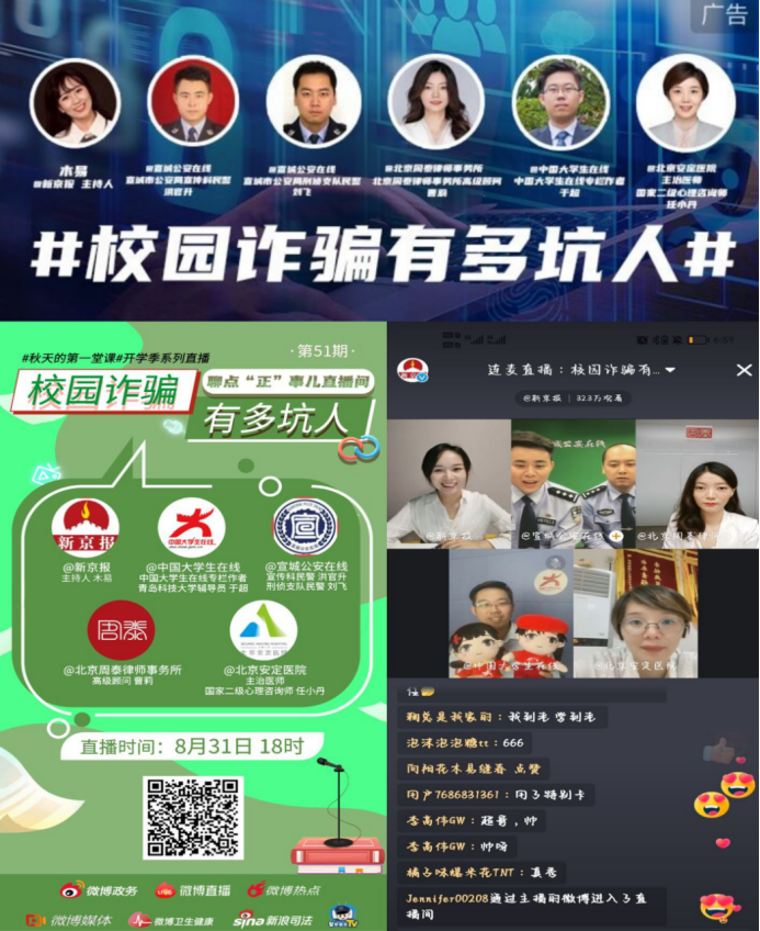 8月31日晚,MK体育辅导员于超应邀做客中国老员工在线直播间,以“校园诈骗到底有多坑人?”为主题,与全国高校教育工作者、老员工网友进行了在线交流。活动由新京报木易主持。