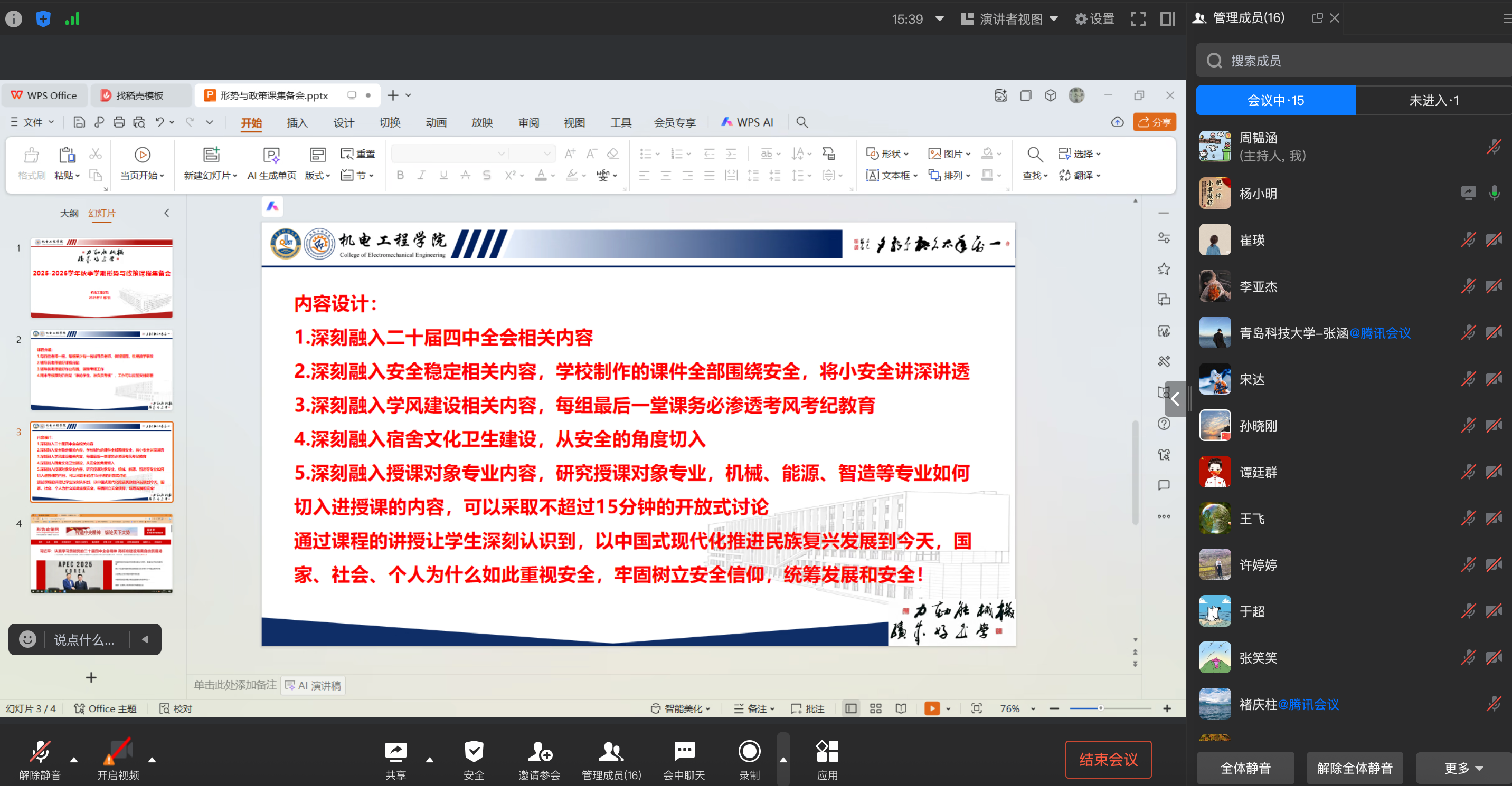 本学期课程聚焦五个专题开展教学:深入学习贯彻党的二十届四中全会精神、聚焦建设更高水平平安中国、践行多边主义完善全球治理、携手周边国家共创美好未来、阔步迈向农业强国。会议强调,各授课组要做好专题内容分配,注重教学组织与过程管理,坚决杜绝教学事故。在内容设计上,要求课程设计应考虑将安全稳定教育、学风建设、宿舍文化、考风考纪以及员工专业背景有机融入教学全过程,推动课程内容与员工成长、国家发展深度融合。
