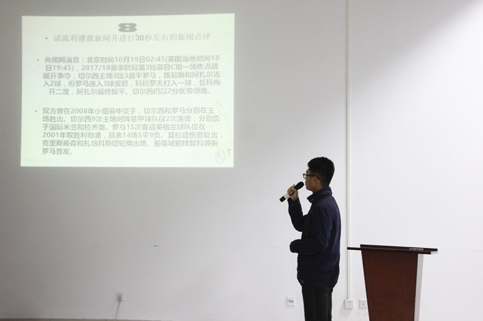 本次比赛包括自我介绍及才艺展示、现场选答和评委点评三个环节。在主持人刘宝忠精彩的开场白下,比赛正式拉开序幕,选手们闪亮登场,他们用自己独特的方式进行自我介绍,各个多才多艺,发挥特长向评委们展现自信的自己。接着,由选手在非凡逻辑、口才考验、情景设置和即兴播报四个类型中根据特长及意愿自行选择并应答,选手们灵活多变,良好的语言表达基础和临场应变能力充分展示出了他们扎实的主持功底。最后,由广播站优秀播音员田依林对选手的表现做了综合评价,充分肯定了部分选手良好的语言表达能力和临场应变能力,表达了对选手们决赛表现的期待并对此次活动的主办方表示了感谢。至此,​MK体育第四届主持人大赛初赛在观众们热烈的掌声中圆满落下帷幕。