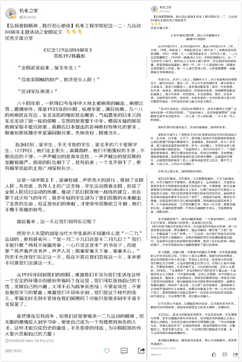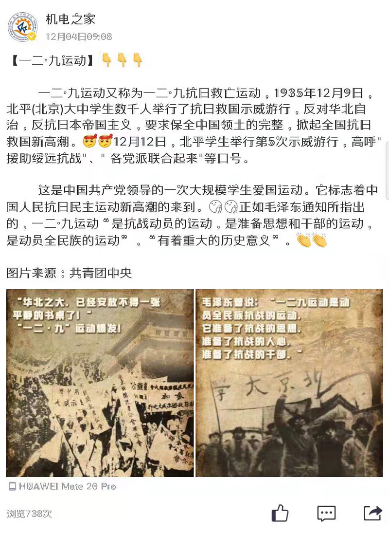 MK体育面向全体2019级青年员工开展“纪念一二•九运动”爱国主题征文活动,征文活动发出后,受到广泛且热烈的追捧,经选拔,共计五篇优秀征文脱颖而出,在公司员工会自媒体平台“机电之家”公众号上推广展示。