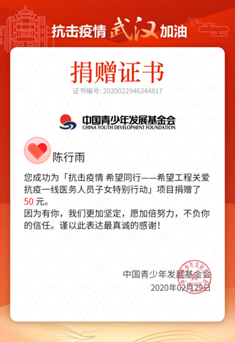 5、(捐款)陈行雨、李玉娇、宋文阳、蔡玮等同学通过各种慈善组织进行捐款志愿抗疫一线,贡献自己的一份力量。