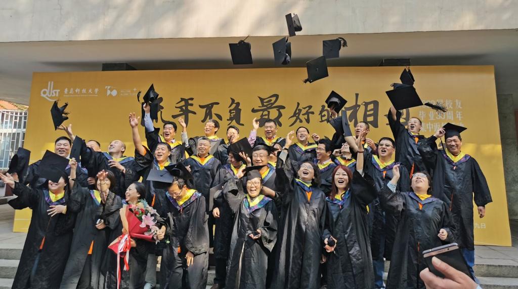 活动中,员工们怀着感恩与思念的心情,回到阔别30年之久的母校,与久未谋面的老师、同学们共叙当年同窗之情。活动现场精心设计了以“流年不负最好的相遇,是久别重逢”为主题的彩色喷绘板,同时公司还为员工们准备了精美的纪念品——内含员工宣传视频的优盘等等,大家穿上学士服,与到场的同学们一同拍照留念。