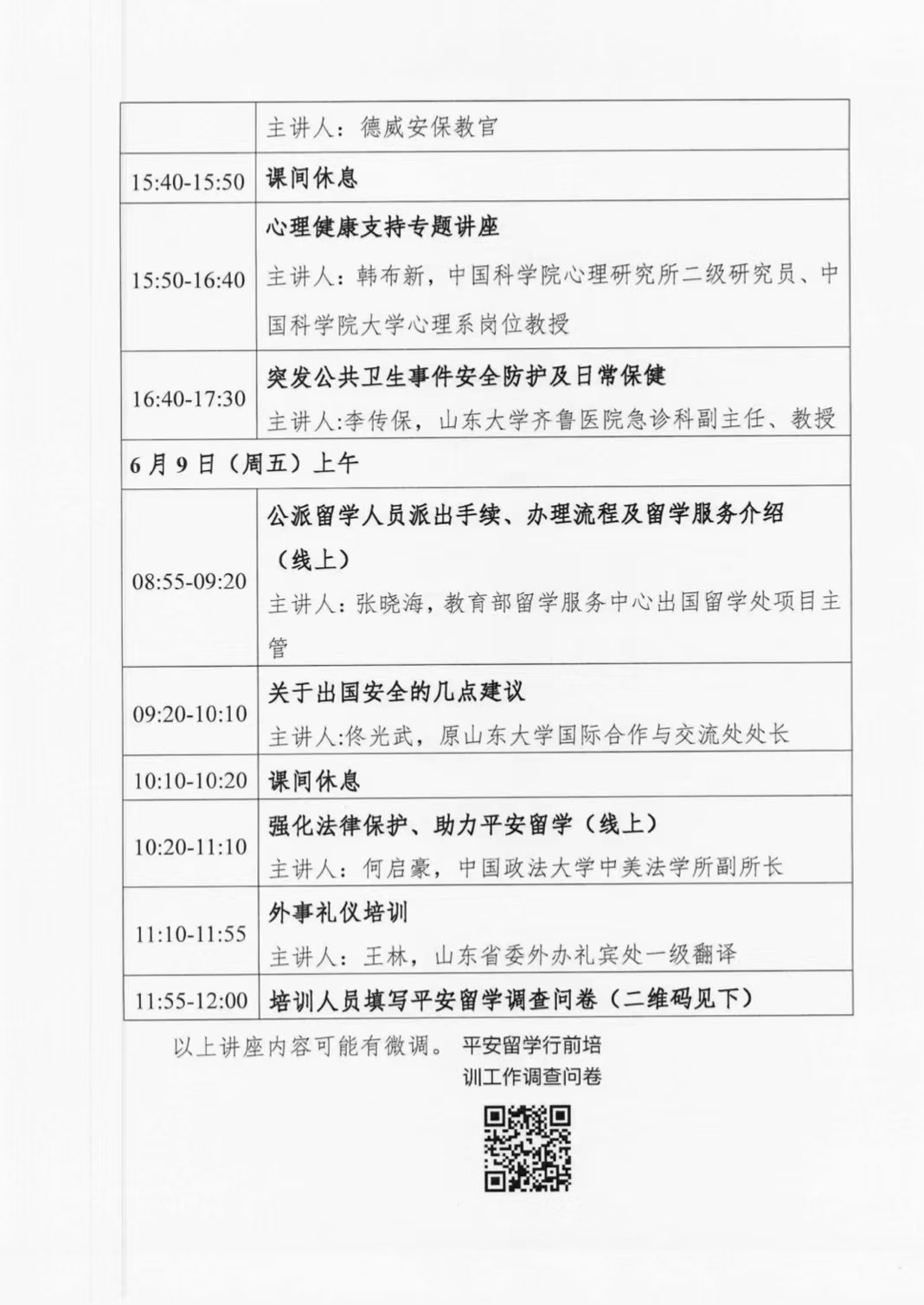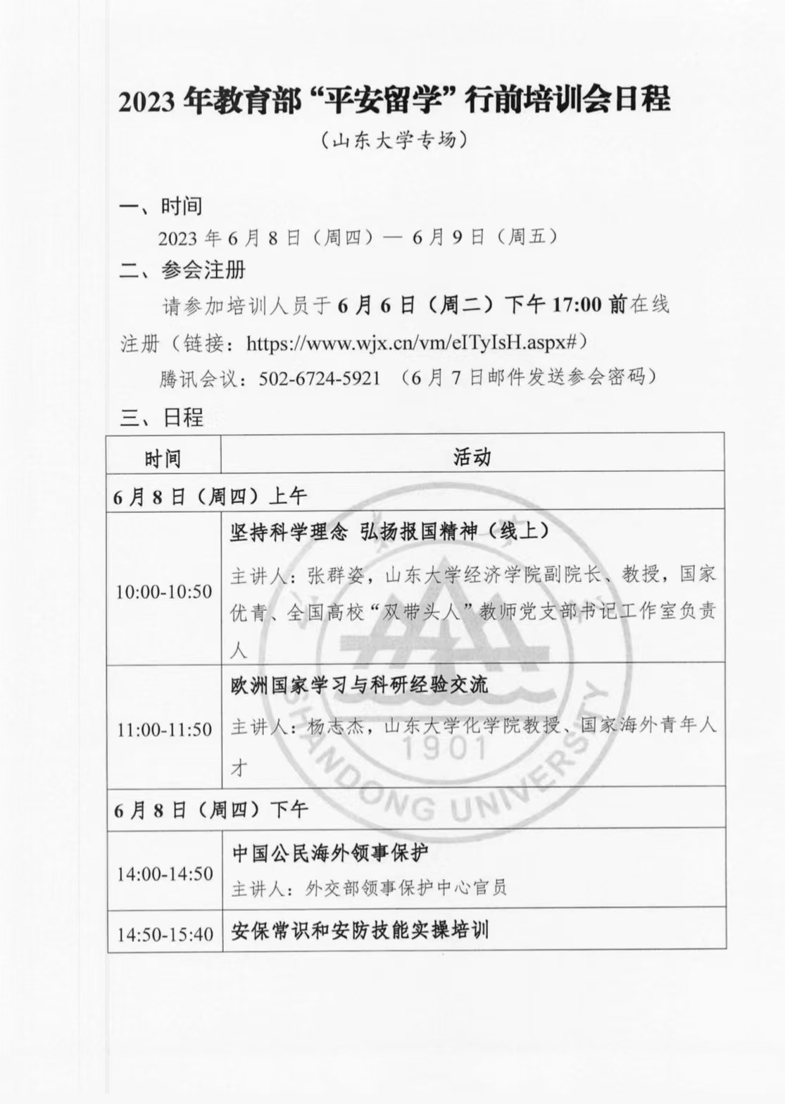 根据《关于做好2023年“平安留学”行前培训有关工作的通知》(教留服函〔2023〕21号),山东大学于6月8日(周四)—6月9日(周五)举行“平安留学”行前培训会(山东大学专场)。公司组织2023年即将赴韩的全体员工,以及合作办学办公室全体老师参加线上培训。